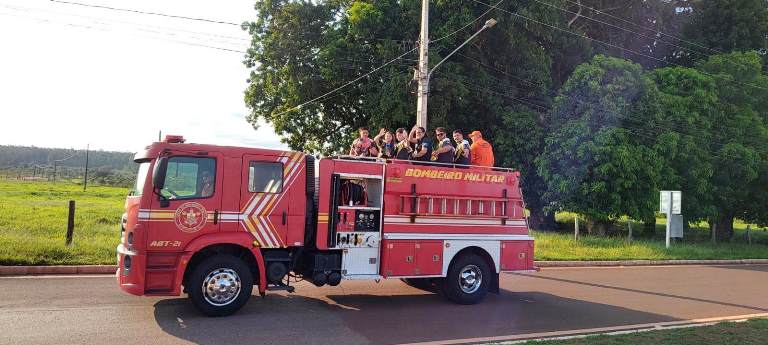 Atletas desfilaram em carro do Corpo de Bombeiros. (Foto: Sônia Cristaldo \ Fronteira News)