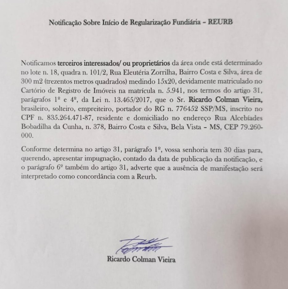 Edital de Notificação sobre inicio de Regularização Fundiária – REURB