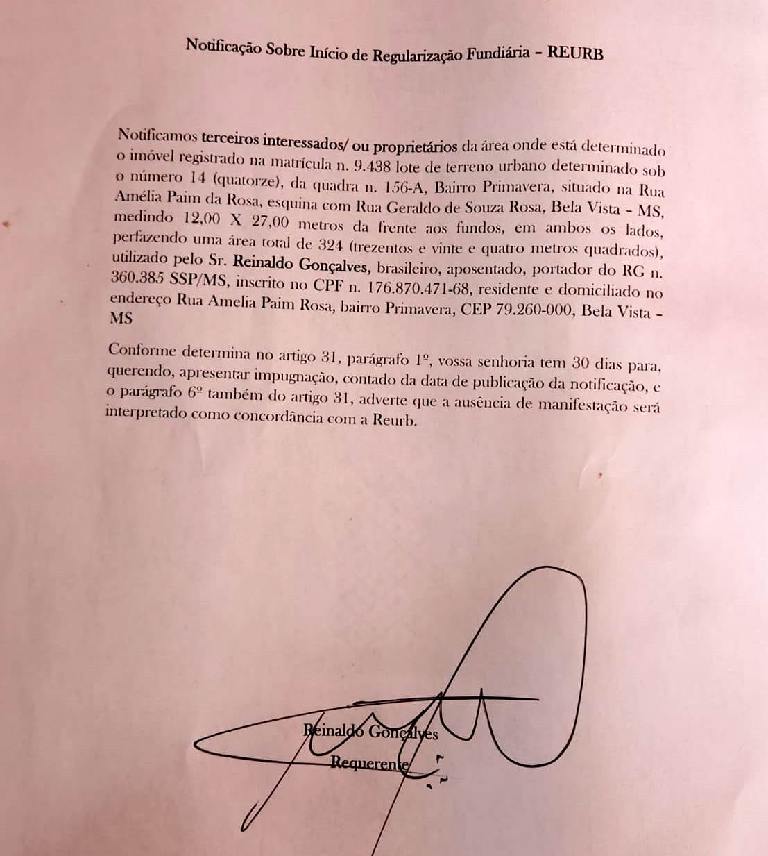 Notificamos terceiros interessados\ ou proprietários da área onde esta determinando o imóvel registrado na matricula n° 9.438 lote de terreno urbano determinado sob o numero 14 (quatorze), da quadra n. 156-A, Bairro Primavera, situado na Rua Amélia Paim Rosa, esauina com Rua Geraldo de Souza Rosa, Bela Vista – MS, medindo 12,00 x 27,00 metros da frente aos fundos, em ambos os lados, perfazendo uma área total de 324 (trezentos e vinte e quatro metros quadrados), utilizado pelo Sr. Reinaldo Gonçalves, brasileiro, aposentado, portador da RG n° 360.385 SSP\MS, inscrito no CPF. 176.870. 471-68, residente e domiciliado no endereço Rua Amélia Paim Rosa, no bairro Primavera, CEP – 79.260.000, Bela Vista – MS.