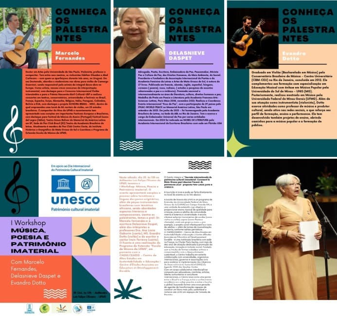 O evento marca o início de uma série de workshops promovidos pelo Programa de Extensão Escola de Música da UFMS em parceria com o CAESE|CEAEDD (Centro de Altos Estudos em Sustentabilidade e Educação), instituição brasileira com sede na França que atua junto à UNESCO na promoção da educação, cultura e desenvolvimento sustentável.