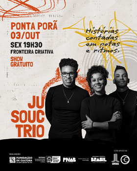 Depois de passar por Campo Grande e Naviraí, o projeto “Ju Souc Trio” desembarca em Ponta Porã, terceira cidade a receber a circulação que percorre quatro municípios de Mato Grosso do Sul. O show será realizado nesta sexta-feira (3), às 19h30, na Feira Fronteira Criativa, dentro da Praça Pedro Manvailer, que fica na Rua Antônio João esquina com a Rua Sete de Setembro, centro do município. A entrada é gratuita e a classificação é livre.